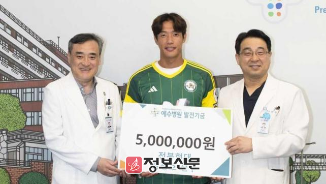 전북현대 홍정호 선수가 지난 24일(목) ‘예수병원’을 찾아 신충식 원장을 비롯해 김호권 기획조정실장, 강종대 사회사업과장 등이 참석한 가운데 기부금 전달식을 가졌다.