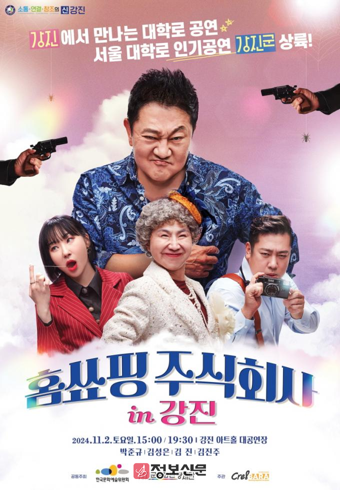‘홈쑈핑 주식회사 in 강진’은 서울 대학로에서 인기리에 공연하고 있는 ‘홈쇼핑 주식회사 국제흥신소’의 강진 버전으로 국밥 팔아 대박 치고 건물주가 된 ‘욕쟁이 할매’가 흥신소를 스타트업이라 우기는 탐정소장을 만나면서 벌어지는 얼렁뚱땅 사건 해결 이야기를 그린 코믹 버라이어티쇼 연극이다.