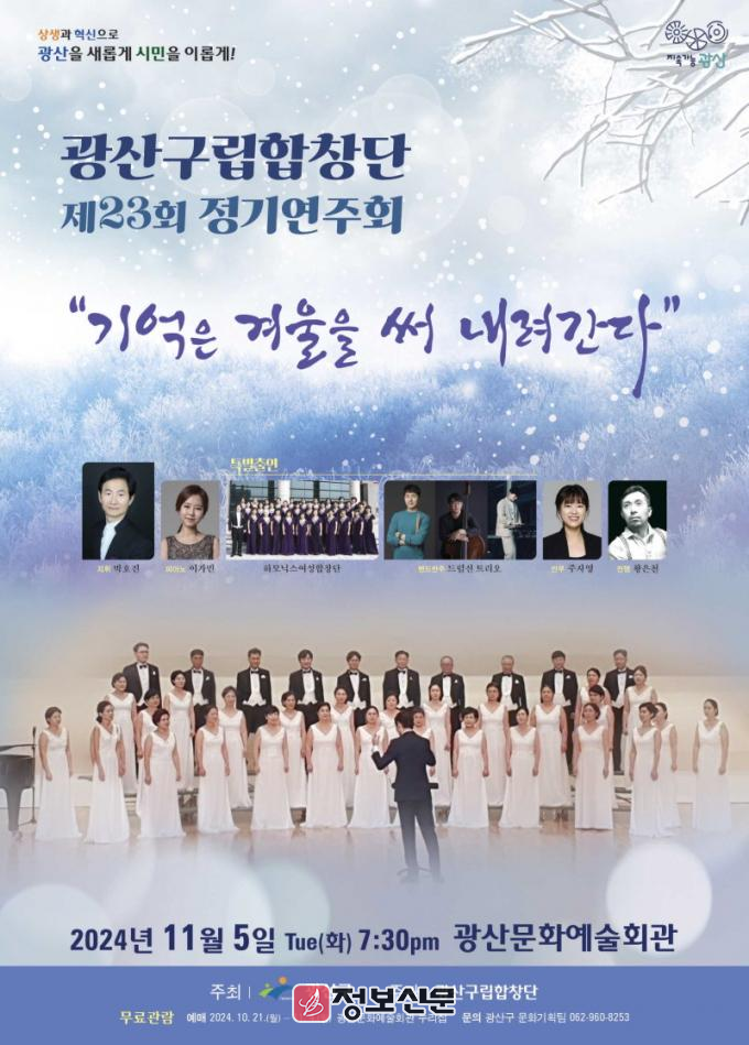 총연출을 맡은 광산구립합창단 박호진 지휘자는 “한 해가 저물어가는 시기 시민에게 희망과 웃음을, 위로와 용기를 주는 공연이 될 것”이라고 말했다. 공연은 시민 누구나 무료로 관람할 수 있다. 관람 사전 신청은 11월 4일까지 광산문화예술회관 누리집 ‘공연 예매란’에서 할 수 있다.