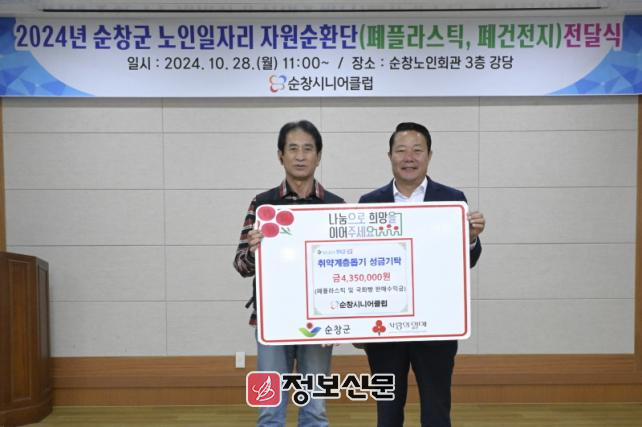 기탁된 수익금은 자원순환단이 폐페트병을 가공·판매해 얻은 331만원과 시니어클럽이 순창장류축제에서 국화빵을 판매한 수익금 103만원으로 구성됐다. 여기에 폐건전지 수거 활성화 지원사업단 어르신들이 11개 읍·면 전역에서 수거한 폐건전지 1,000개도 함께 전달됐다.
