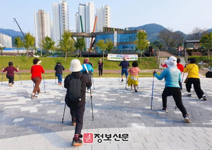 ‘건강 업고 뛰어!’는 매주 화요일 오전, 오후에 1시간씩 황룡강 일원에서 진행된다. 주민들의 수요를 감안해 에어로빅, 생활체조, 노르딕 워킹, 맨발 걷기 등으로 다양하게 구성한 점이 특징이다.