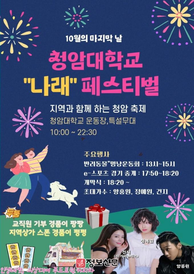 한편, 교수와 교직원들이 기증한 물품을 경품으로 제공해 축제에 참여하는 이들과 나눔을 실천할 기회를 마련했다. 청암대학교는 이번 "나래" 페스티벌이 단순한 학생 축제를 넘어 지역 사회가 함께 어우러지는 축제의 장이 되기를 기대하고 있다.