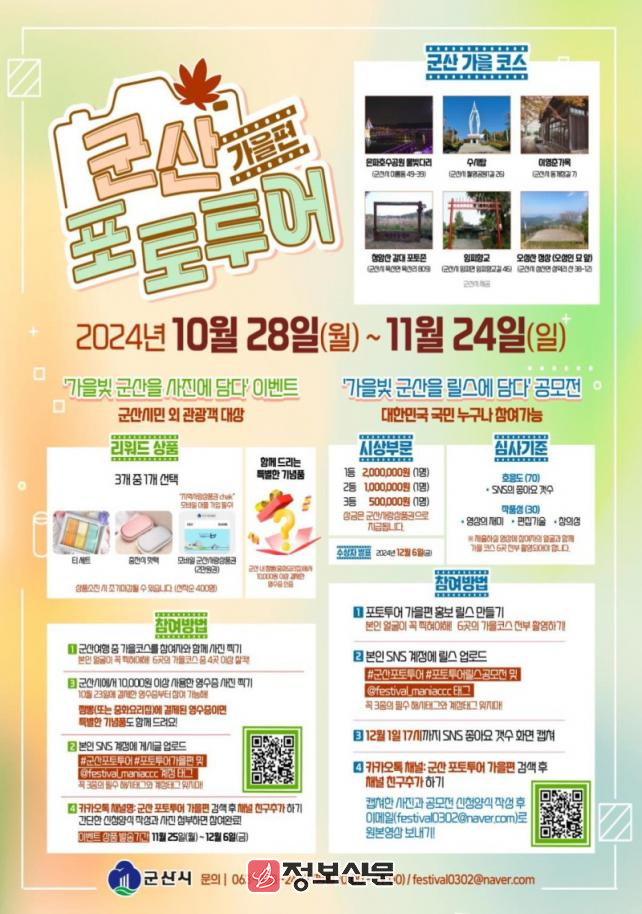 ![]() 군산시, 가을빛 군산을 담다 포토투어 및 릴스 공모전 개최 |