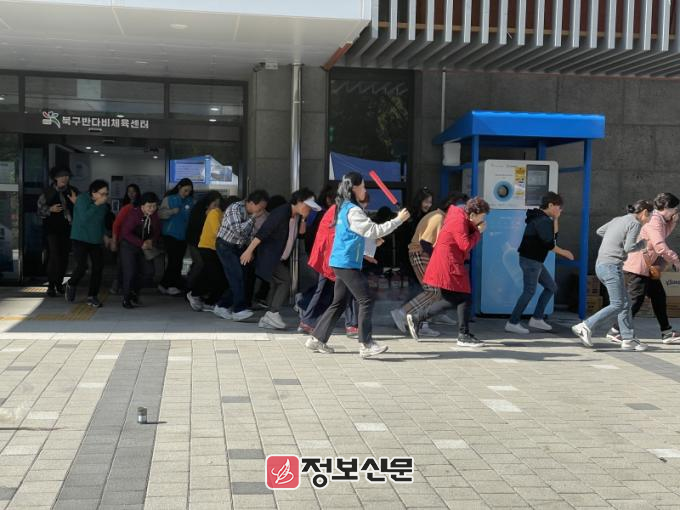 북구반다비체육센터는 일 이용객 650여 명에 이르는 다중밀집시설로 대형화재 발생 시 많은 인명피해가 있을 것으로 예상되는 만큼 초기대응, 비상대응, 수습‧복구 단계순으로 훈련이 실시되었고, 긴급구조통제단, 재난현장 통합지원본부 등을 구성하여 신속한 의사결정 및 조치 훈련을 실시하였다.