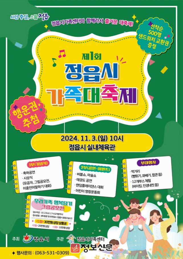 정읍시 관계자는 “가족 친화 문화를 확산시키고 모든 가족이 정읍의 주인공으로 함께 할 수 있는 뜻깊은 행사가 될 것”이라며 “안전 관리에도 최선을 다해 즐겁고 무사히 마무리될 수 있도록 만반의 준비를 하겠다”고 말했다.