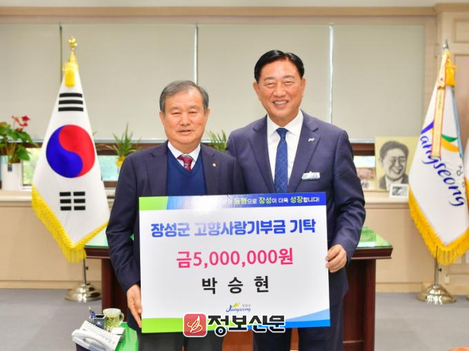 장성군에 따르면 진원면 출신 박승현 전 재광장성군향우회장이 최근 고향사랑기부금 개인 상한액인 500만 원을 군에 쾌척했다. 답례품으로 받는 150만 원 상당 물품도 고향 불우이웃을 후원하기로 해 훈훈함을 더했다.