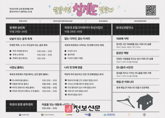 이 프로젝트는 전남도, 무안군, 청계면상인회, 목포대 로컬크리에이터육성사업단·총학생회가 함께 추진한다. 지난 17일부터 8가지 세부 행사가 시작됐다. 로컬 커뮤니티 살롱인 ‘100배 식탁’과 ‘없었던 책방’, 상권 아카이빙 프로젝트인 ‘언니들의 사진전’ 등이 열리고, 상인 협력 클래스 ‘사장님 클래스’도 선보인다.