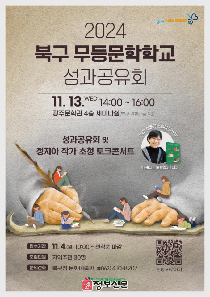 문인 북구청장은 “무등문학학교 수강생들의 생애 첫 작품 감상과 더불어 유명작가 작품․강연도 즐길 수 있는 이번 성과공유회에 주민들의 많은 관심과 성원 바란다”며 “앞으로도 주민들이 문학 활동을 폭넓게 누릴 수 있도록 다양한 정책들을 발굴해 나가겠다”고 말했다.