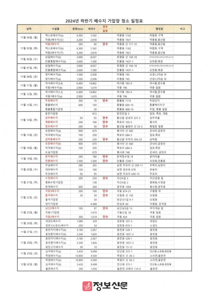 시는 배수지별로 청소를 순차 진행해 안정적으로 수돗물을 공급하고, 시민 불편을 최소화할 계획이다. 물탱크가 2개인 배수지는 청소와 급수를 교대로 진행하나, 물탱크가 1개인 일부 배수지의 경우 단수가 불가피함에 따라 13개 지역 약 3,400세대가 단수될 예정이다.