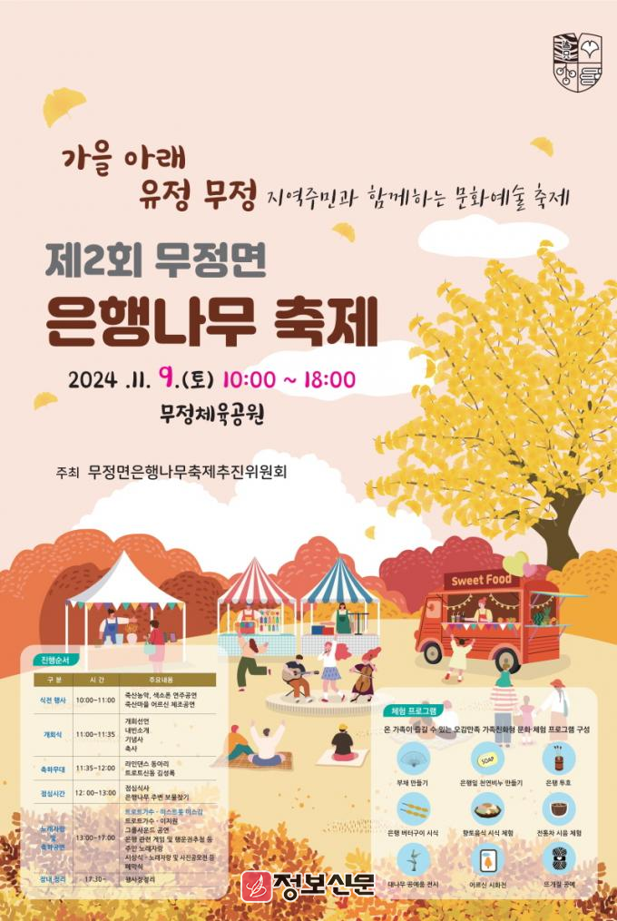 정일남 무정면 은행나무축제 추진위원장은 “아름다운 가을 풍경이 펼쳐지는 무정면에서 소중한 분들과 특별한 시간을 보내시고, 많은 분이 오셔서 무정의 자연과 속에서 가을 감성을 듬뿍 담아 가시기 바란다”라고 말했다.