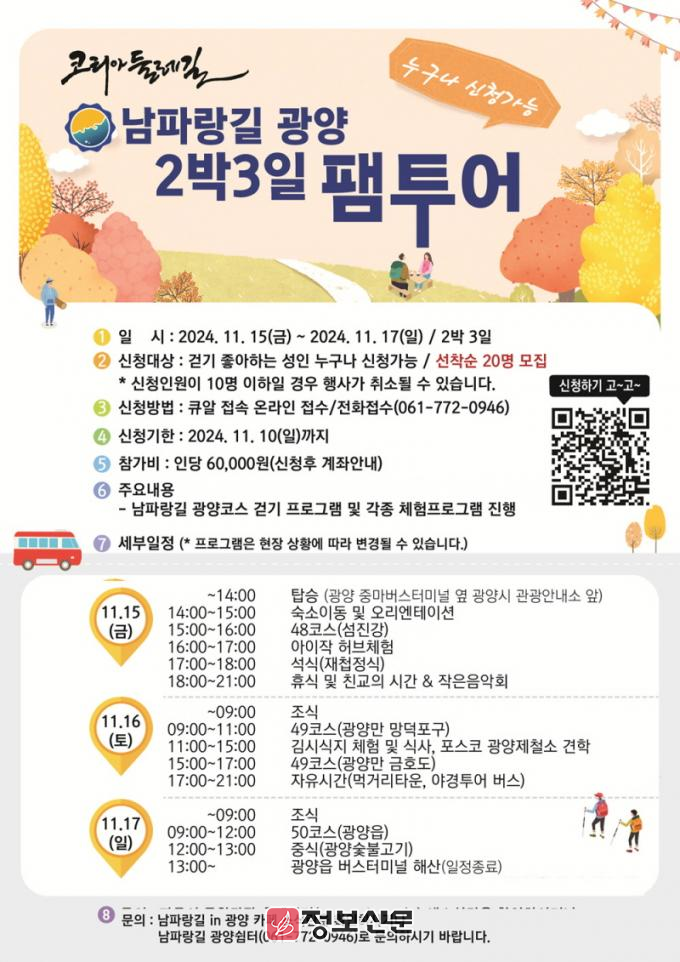 이번 투어는 남파랑길 걷기를 비롯해 김시식지 방문, 광양제철소 견학, 광양 맛 체험 등 광양의 가을을 오감으로 즐길 수 있는 다채로운 프로그램들로 구성됐다. 투어 기간은 오는 15일부터 17일까지이며 모집 규모는 20명이다. 걷기를 좋아하는 성인이면 누구나 참가할 수 있다. 참가비는 6만 원으로 숙박과 재첩정식, 광양불고기 등 광양의 대표 음식을 두루 맛볼 수 있는 기회를 제공한다.