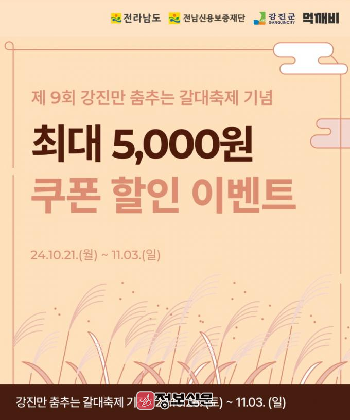 이번 공공배달앱 먹깨비 할인 이벤트는 갈대 축제 기간인 10월 26일 토요일부터 11월 3일 일요일까지는 최대 5천 원, 그 외 기간 10월 21일 월요일부터 10월 25일 금요일까지는 매일 3천 원 할인 쿠폰을 지급했다.