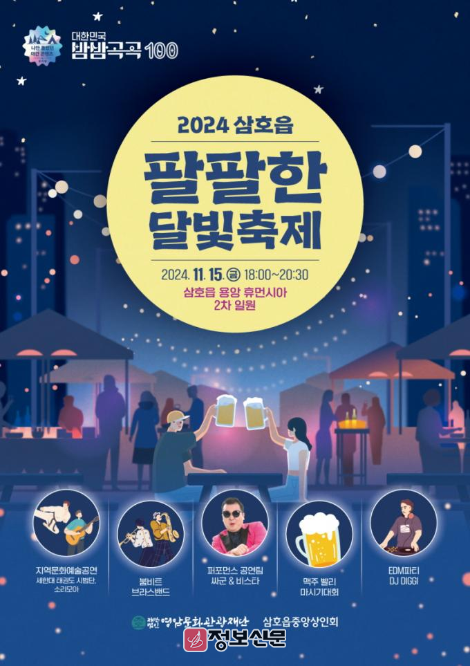 팔팔한 삼호읍 달빛축제는 삼호읍 풍물패의 흥겨운 식전 공연을 시작으로 세한대학교 태권도 시범과 소리 모아 동호회의 통기타 연주로 열린다. 이어 등장하는 이미테이션 싸이 ‘싸군’은 인기 가수의 노래를 자신만의 스타일로 재해석해 많은 사랑을 받아온 모창 퍼포머로 그의 개성 넘치는 무대로 본 공연이 시작된다.