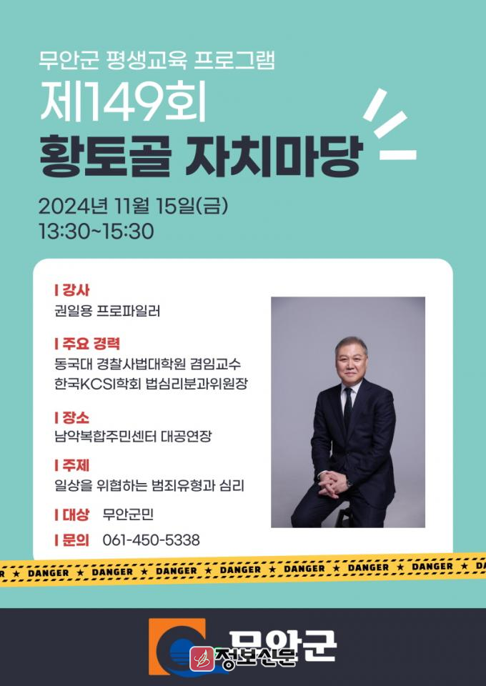 ![]() 무안군, 권일용 프로파일러 초청 제149회 황토골 자치마당 개최 |