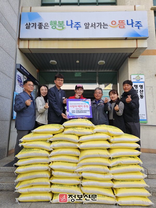 ![]() 임씨 부부가 영산동 행정복지센터에 백미 40포를 기탁하고 있다. (사진제공-나주시) |
