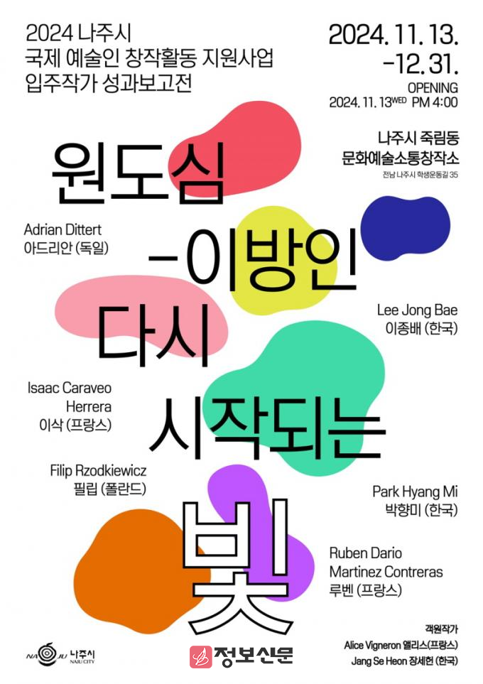 ![]() 2024 나주시 국제 예술인 창작활동 지원사업 입주작가 성과보고전 ‘원도심-이방인 다시 시작되는 빛’ 포스터. (사진제공-나주시) |