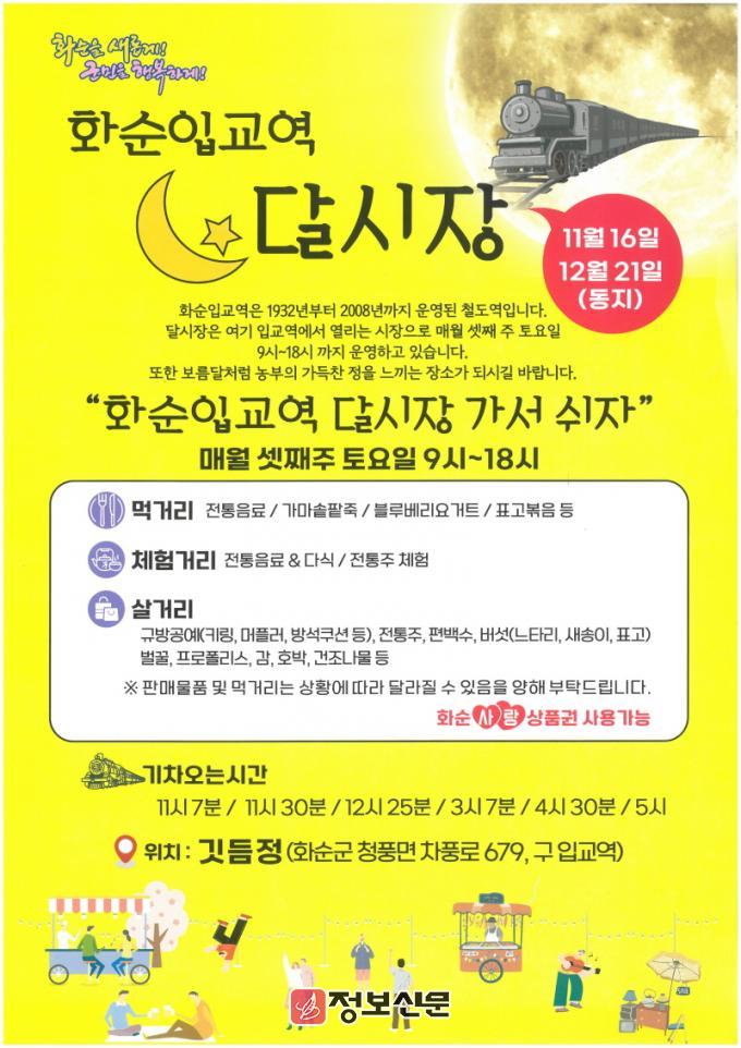 ![]() 화순군, 화순입교역 달시장 판매장터 11월 16일 개장 |