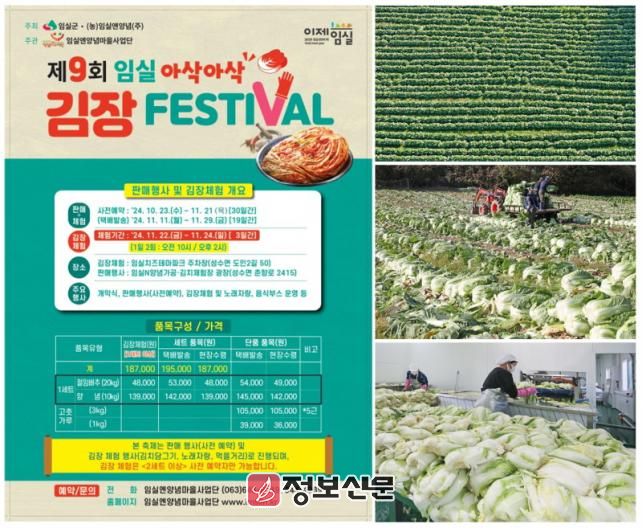 임실 아삭아삭 김장페스티벌은 축제 현장에서 김장을 하는‘김장체험’과 택배 배송이나 현장 수령(드라이브 스루)으로 절임배추와 양념을 받아볼 수 있는‘판매행사’로 진행된다. 절임배추(20kg)와 양념(10kg) 세트품목 가격은 18만7000원이다.(택배비 별도)