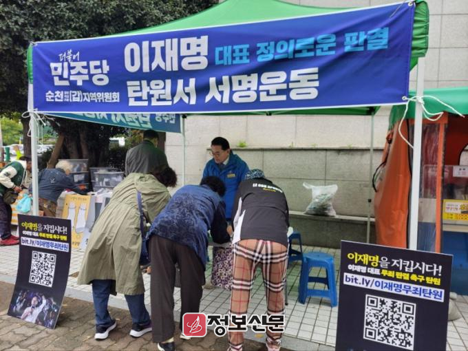 순천 갑 지역위원회는 지난 10월 28일부터 이재명 대표의 무죄 판결을 촉구하는 서명 운동을 시작했으며, 지역위원회 소속 당원뿐만 아니라 지역 주민들도 적극적으로 참여하면서 서명 운동에 큰 동력을 보탰다.