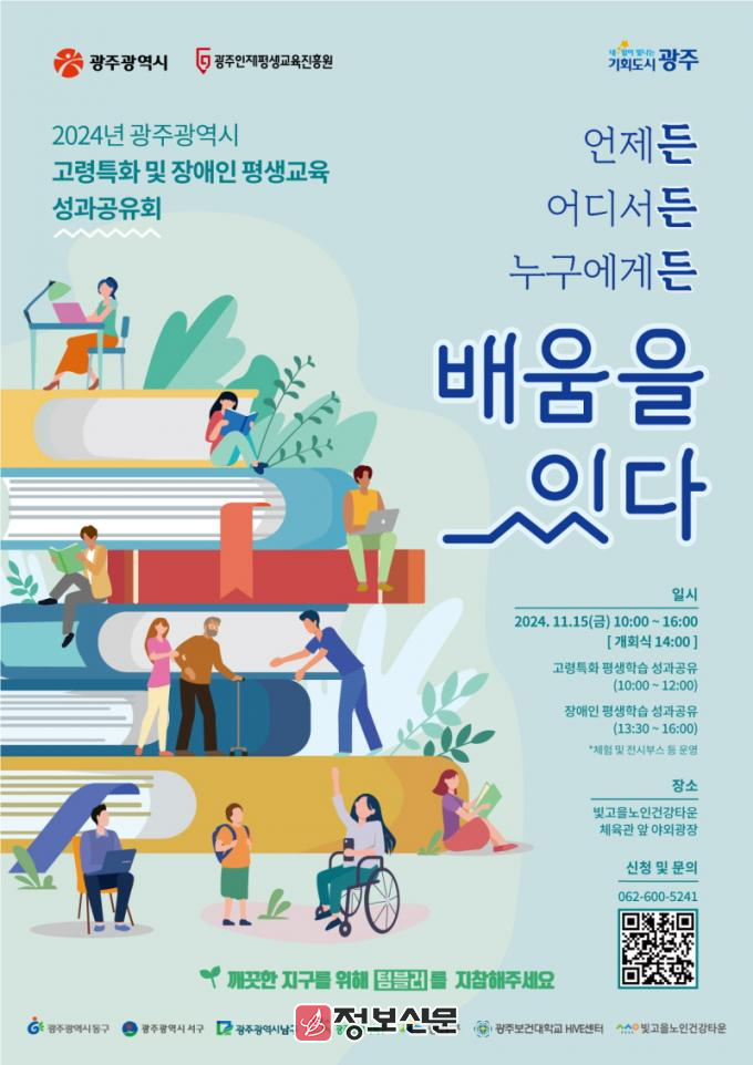 ‘언제든 어디서든 누구에게든 배움을 잇다’를 주제로 마련된 성과공유회는 한 해 동안 추진한 ‘고령특화 평생학습 지원사업’과 ‘광주 장애인 평생교육 사업’의 성과를 나누고, 기관과 학습자가 소통하는 자리로 꾸며진다. 특히 고령 학습자와 장애인 평생교육 참여자, 강사, 기관 관계자가 참여해 현장의 이야기를 생생하게 들려줄 계획이다.