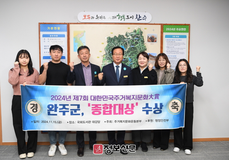14일 완주군은 주거복지문화운동본부가 주최하고 행정안전부가 후원해 열린 제7회 주거복지문화대상 시상식에서 주거복지 분야 발전에 공헌한 성과를 인정받아 1위인 종합대상을 수상했다고 밝혔다.