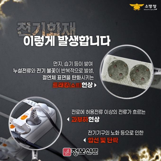 전기화재 예방 안전수칙으로는 ▲문어발식 전기 콘센트 사용 금지 ▲합선 예방을 위한 전선 피복 손상 여부 확인 ▲사용하지 않는 전기제품의 전원을 끄고 플러그 제거 ▲플러그 머리 부분 잡고 뽑기 ▲젖은 손으로 콘센트 만지지 않기 등이다.