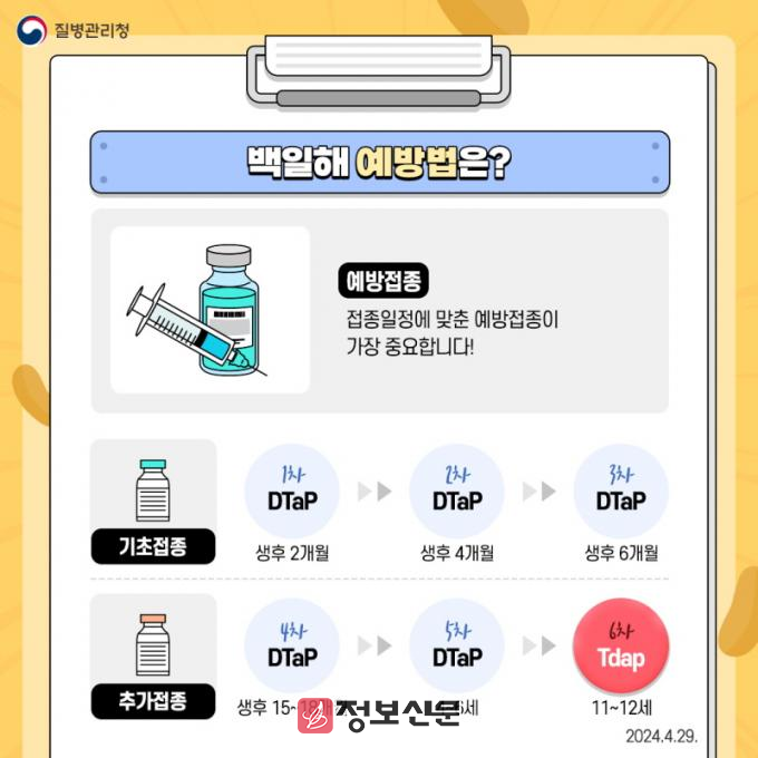 영유아는 기초 3회(2·4·6개월), 추가 3회(15~18개월, 4~6세, 11~12세) 총 6회 적기 예방접종을 하는 것이 중요하며, 임신부의 경우 생후 첫 접종(2개월) 이전 영아가 백일해에 대한 면역력을 갖고 태어날 수 있도록 임신 3기(27~36주)에 예방접종을 해야 한다.
