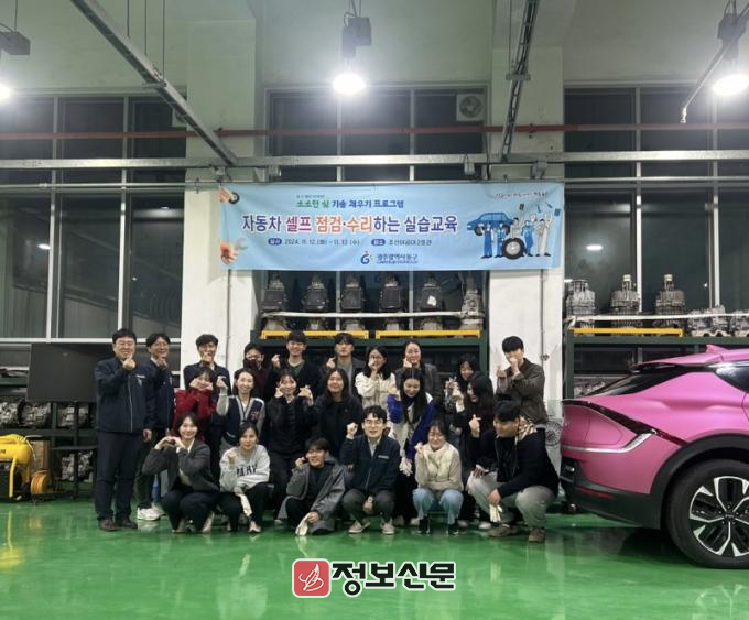 이번 프로그램은 청년 창업자와 지역 공방 및 조선이공대학교와 협업으로 운영 중이다. 지난 12~13일 양일간 조선이공대학 내 자동차 실습장에서 ‘자동차 셀프 점검·수리 실습 교육’을 진행했다.