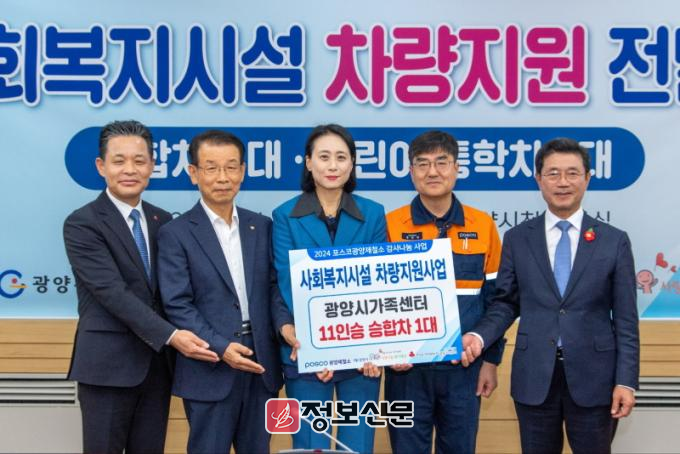 광양제철소는 이날 광양시청에서 사회복지시설 차량 전달식을 열고 취약계층의 원활한 이동권 보장과 권익 증진에 나섰다. 전달식에는 정인화 광양시장, 정상경 광양제철소 행정부소장, 김동극 사회복지공동모금 사무처장, 김재경 사랑나눔복지재단 이사장 등 70여 명이 참석했다.