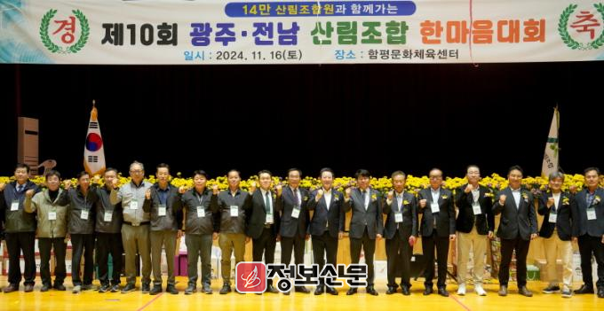 ![]() 김영록 전라남도지사가 16일 함평문화체육센터에서 열린 ‘2024 광주·전남 산림조합 임직원 한마음 대회’에서 참석자들과 기념촬영을 하고 있다. |