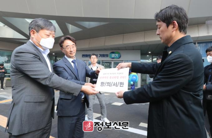 ![]() [사진 제공 = 신천지예수교회15일 오후 경기도청 앞에서 편파적인 종교탄압 규탄 결의대회가 마친 뒤 신천지예수교회 관계자들이 경기도청사를 방문해 항의서한을 경기도청 관계자들에게 전달하고 있는 모습. |