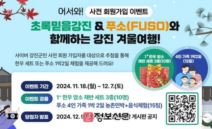 이번 이벤트에서는 참여자에게 추첨을 통해 강진의 특산물인 1+ 한우 세트(10명)와 강진의 대표 농촌 민박 체험 프로그램인 푸소(FUSO) 1박2일 체험권(15팀)을 제공해, 지역 경제 활성화에도 기여할 것으로 기대된다. 이벤트 당첨자는 12월 9일 강진군 홈페이지 공지사항 게시판을 통해 발표된다.