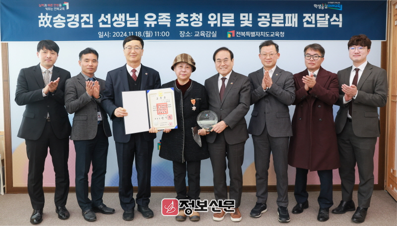 이에 전북교육청은 29년간 학생 교육에 헌신한 고인의 뜻을 기리고 고인의 가족을 위로하기 위해 이날 근정포장 전수식과 함께 공로패 전달식을 개최했다.