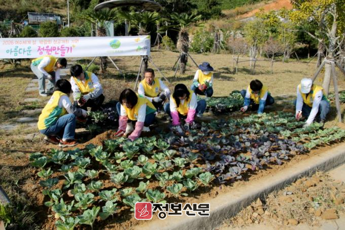 이날 여수지부 회원 60여 명과 화양면 관계자들은 아름다운 겨울 정원을 조성하기 위해 화양면 장수리 도시숲 부지에서 꽃양배추, 겨울 팬지 2종 총 2600여 본을 식재했다.