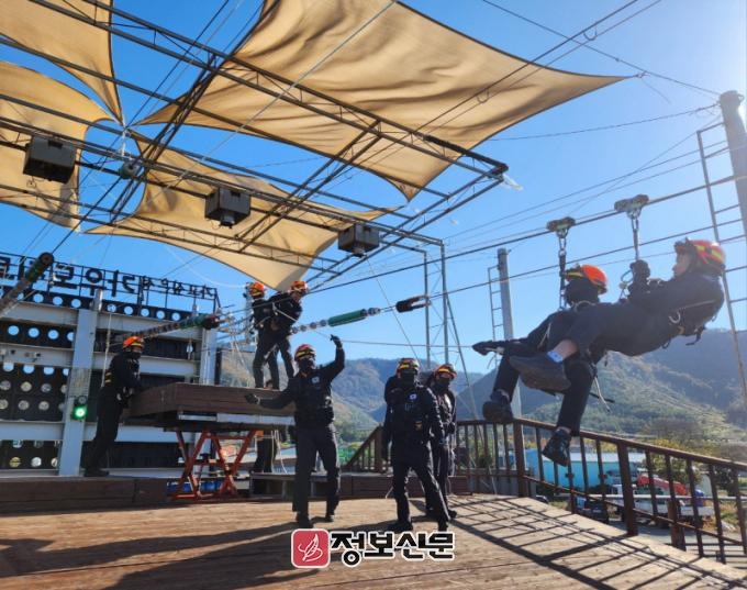주요 훈련 내용으로는 ▶짚라인 업체의 마중이를 이용한 기계식 구조, ▶구조대원이 주레일을 이용하여 구조대상자에게 접근하는 접근식 구조 방법 등이었다.