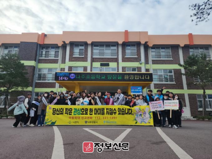 이날 나주초등학교와 금천중학교 정문 앞에서 관계기관 소속 80여 명이 학생과 학부모를 대상으로 아동학대 예방과 긍정 양육 방법을 담은 홍보물을 배포하며 아동 보호의 필요성을 알렸다.
