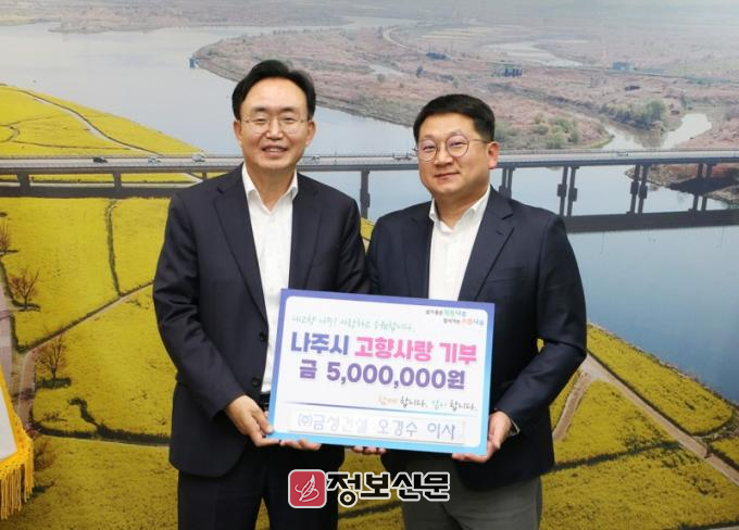 ![]() 최근 ㈜금성건설은 나주시에 고향사랑기부금 500만원을 기탁했다. (사진설명-나주시) |