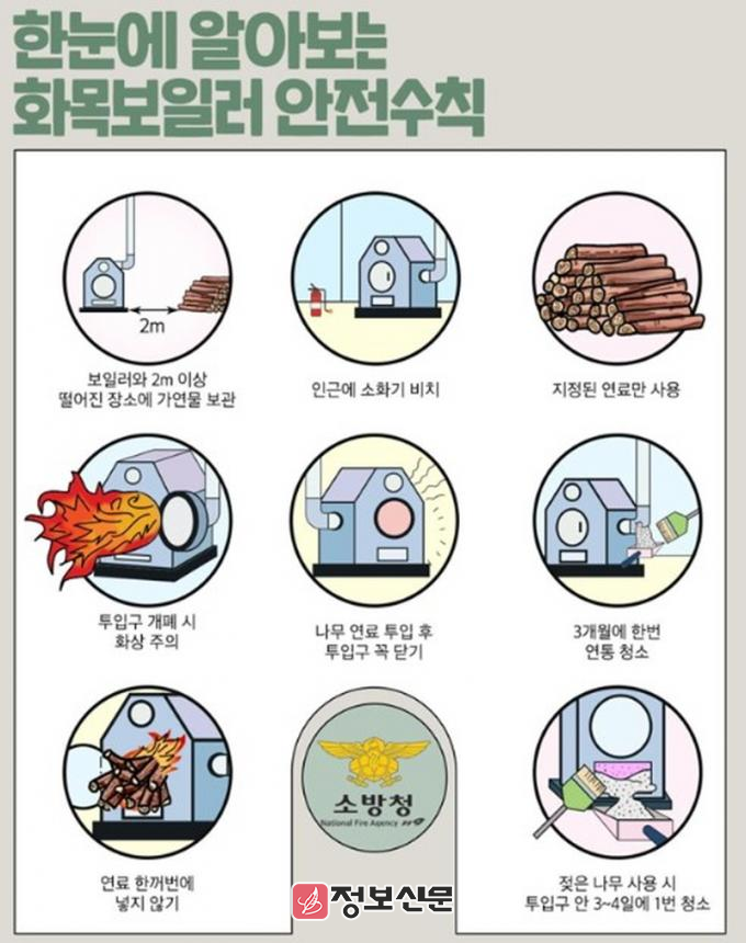 화목보일러 안전수칙은 ▲보일러 주변 가연물 보관 금지 ▲청소 전 남은 불씨 확인 ▲연통 문 닫고 사용하기 ▲근처에 소화기 비치 ▲연통 자주 청소하기 등이다.