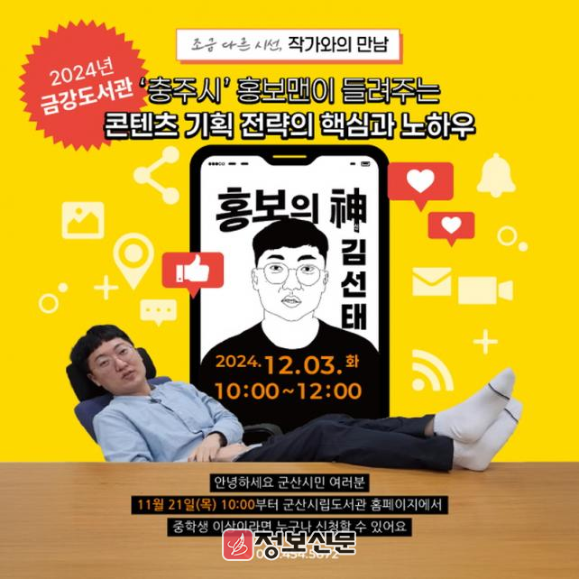 금강도서관이 준비한 이번 강연에서 김선태 주무관은 ‘홍보의 神’ 저자답게 콘텐츠 기획과 홍보 전략에 대한 경험담을 재치있는 입담으로 들려준다.