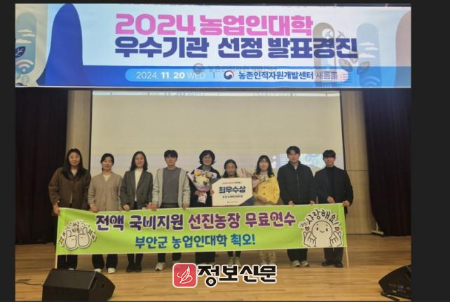 부안군은 2023년 전국 농업인 교육분야 최우수 기관 선정에 이어, 올해 농업인대학 운영 최우수기관에 선정되어 전문농업인 육성분야 2년 연속 최우수상을 받게 되었다.