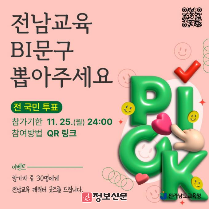 투표는 11월 25일 자정까지 온라인으로 진행되며, 전라남도교육청 대표 누리집(공개자료실)과 ‘전남교육통’에서 참여가 가능하다. 전남교육청은 국민의 손에 의해 문구를 선택한 뒤 전문 디자이너 등과 협력해 BI 디자인을 완성할 계획이다.