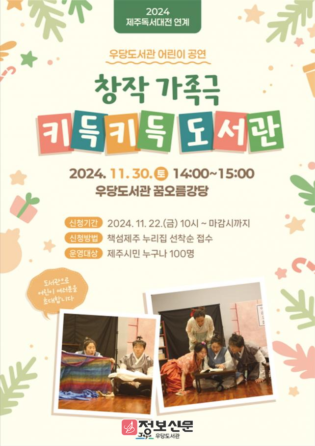 오는 11월 30일 토요일 오후 2시 도서관 꿈오름강당에서 개최되는 「키득키득 도서관」 어린이 공연은 도서관에서 가족과 함께 즐겁고 행복한 시간을 보낼 수 있도록 마련된 창작 가족극이다.