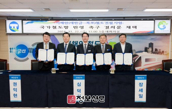 영광군에 따르면 지난 22일 오전 11시 고창군청 대회의실에서 ‘서해안 철도 국가계획 반영 촉구 결의 기자회견’이 열렸다. 장세일 영광군수를 비롯해 심덕섭 고창군수, 권익현 부안군수, 신원식 군산시 부시장, 임만규 함평군 부군수가 참석했다.