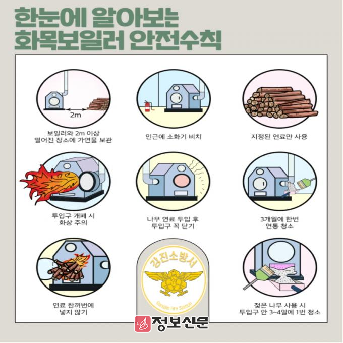 강진소방서가 당부하는 화목보일러 안전수칙은 ▲보일러 주변 2m 이상 떨어진 장소에 가연물 보관 ▲근처에 소화기 비치 ▲나무연료 투입 후 투입구 꼭 닫기 ▲청소 전 남은 불씨 확인 ▲3개월에 한번 연통 청소하기 등이다.