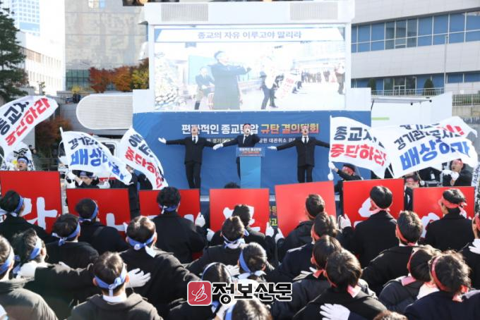 ‘편파적 종교탄압 규탄 결의대회’는 신천지예수교회가 ‘종교지도자 포럼 및 수료식’ 행사를 위해 지난달 29일~31일까지 파주 임진각 평화누리 대관을 신청했으나 경기관광공사가 대관 당일인 29일 오전 갑작스럽게 취소 통보한 것을 계기로 지난 15일부터 시작됐다.