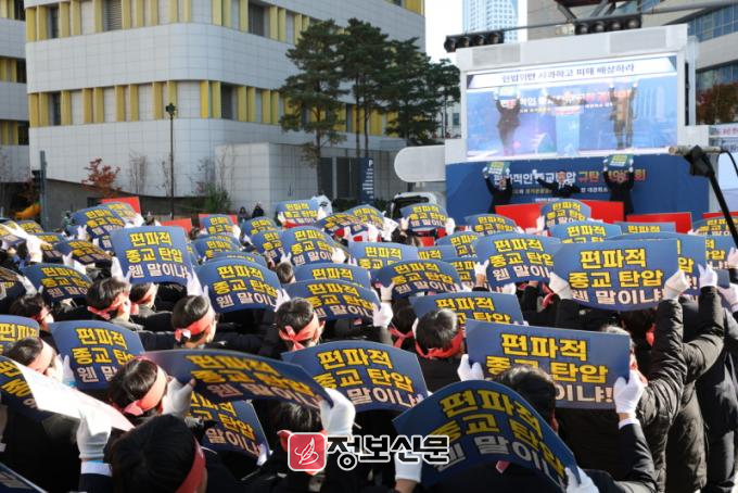 이날 ‘편파적 종교탄압 규탄 결의대회’에 모인 신천지예수교 증거장막성전 베드로지파(이하 신천지 베드로지파)의 성도들은 울분이 가득한 목소리로 ‘편파적인 종교탄압’이 민주공화국인 대한민국에서 절대 있어서는 안 되는 헌법에 반하는 행위임을 강력하게 비판했다.