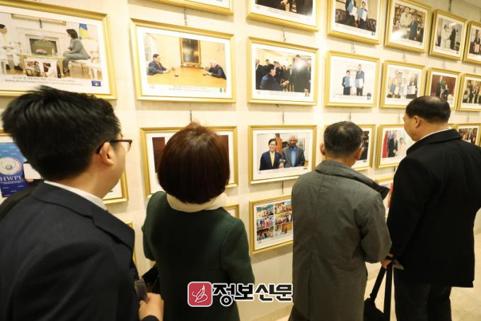 ![]() [사진 제공 = 신천지예수교회]23일 오후 경기도 청평 신천지 평화연수원에서 ‘신천지 말씀 대성회 계시 성취 실상 증거’가 열린 가운데 목회자들이 연수원 지하에 마련된 이만희 총회장의 평화 행보 사진전을 관람하고 있다. |