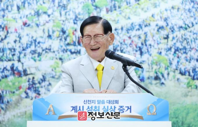 ![]() [사진 제공 = 신천지예수교회]23일 오후 경기도 청평 신천지 평화연수원에서 ‘신천지 말씀 대성회 계시 성취 실상 증거’가 열린 가운데 이만희 총회장이 강연을 하고 있다.