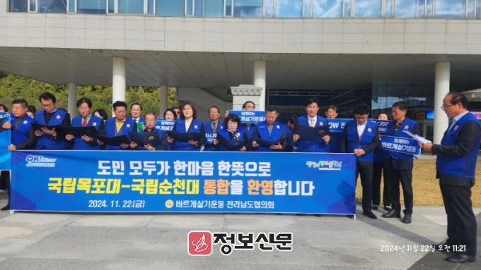 이날 전남도청에서 개최된 성명서 발표 현장에는 바르게살기운동 전라남도협의회 2만여 명의 회원을 대표하여 박주영 바르게살기운동 도협의회장을 비롯한 22개 시군 바르게살기운동협의회 회장단과 임원진 30여 명이 참여해 “지난 15일, 목포대학교와 순천대학교가 대학 통합에 합의하고 통합 의과대학 설립을 결정한 것에 대해 온 도민과 함께 환영의 뜻을 표한다”고 밝혔다.