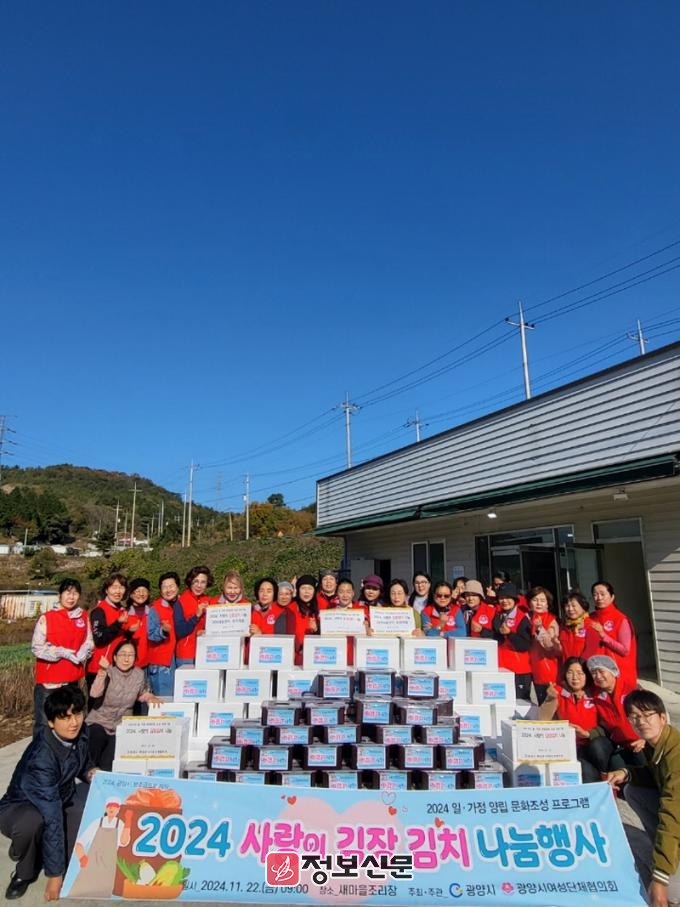 황호순 광양시여성단체협의회장은 “작은 정성이지만 사랑이 담긴 김치를 맛있게 드실 이웃들의 모습을 생각하면 가슴이 훈훈해진다. 앞으로도 나눔 실천에 적극적으로 앞장서며 도움의 손길이 필요한 이웃들을 위해 꾸준히 봉사하겠다”고 밝혔다.